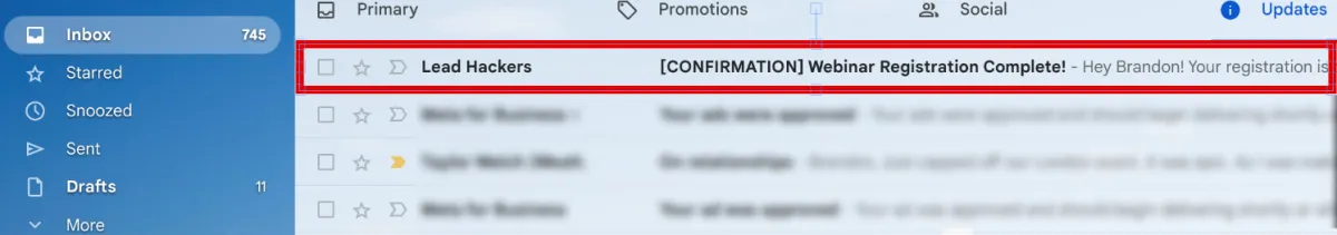 IMPORTANT! In a few minutes you'll receive an email from Lead Hackers with the special link you'll be using to attend this private, live webinar event. It looks like this: